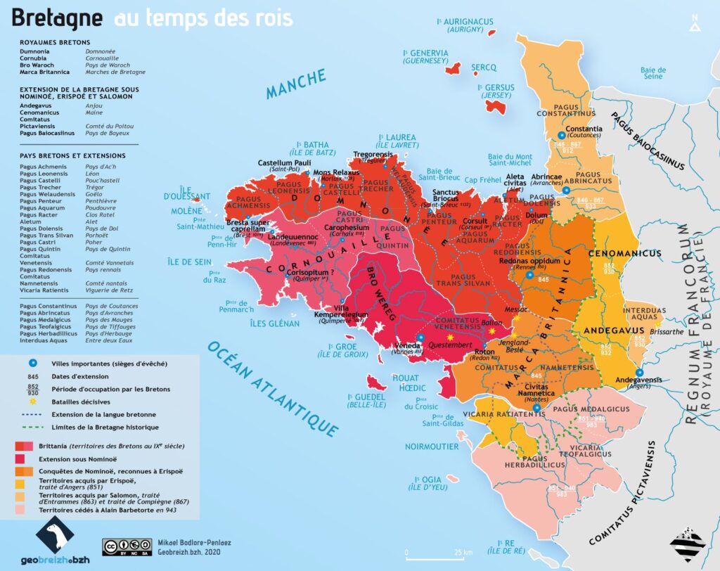 Cette page retrace les grandes étapes de ce parcours : les frontières historiques, les neuf pays bretons traditionnels, la Bretagne au temps des rois, ainsi qu’une chronologie détaillée des événements majeurs, des origines jusqu’à aujourd’hui ;